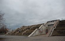 夜、水面に映る廃墟と化したRummu採石場のユーティリティビル(2014年9月)